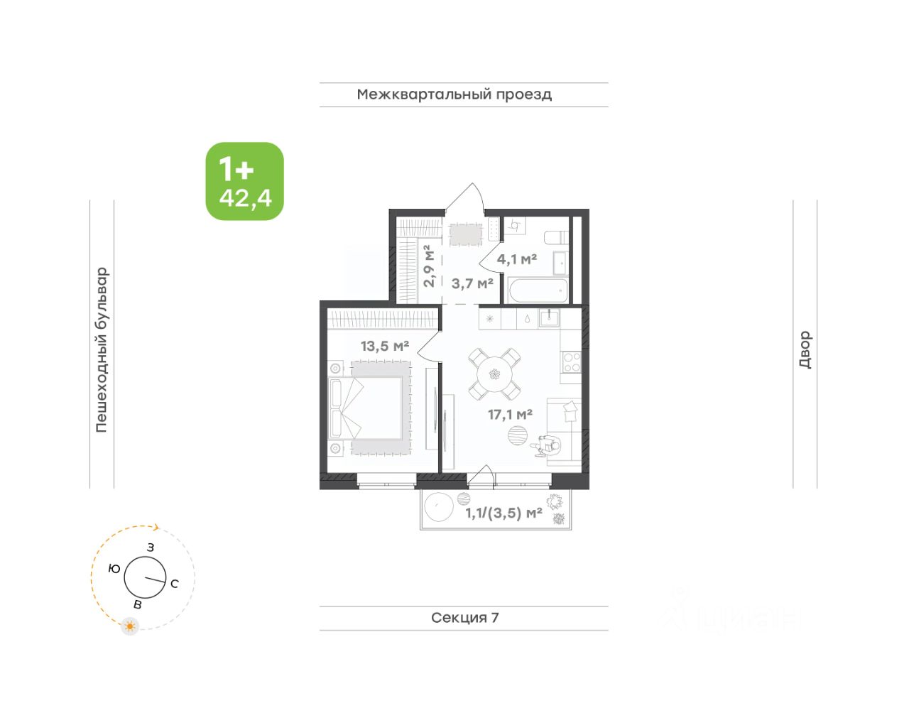 Площадь 42,4 кв.м. с совмещенной кухней-гостиной, обособленной спальней, личной гардеробной и возможностью оборудовать рабочее место.