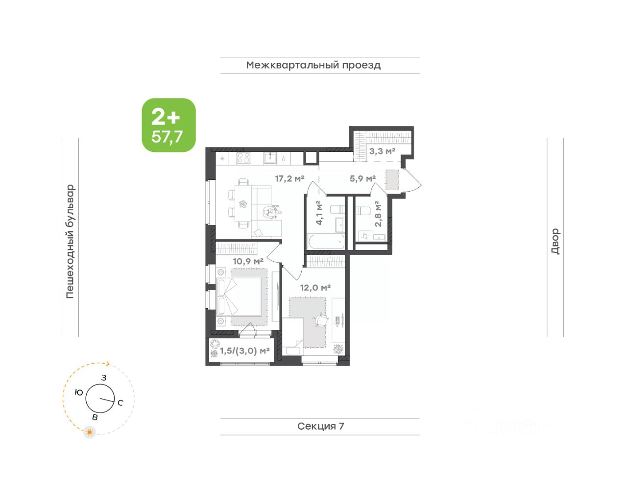 Площадь 57,7 кв.м. с двумя спальнями, двумя санузлами, кухней-гостиной и продуманным зонированием.