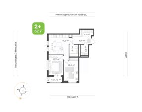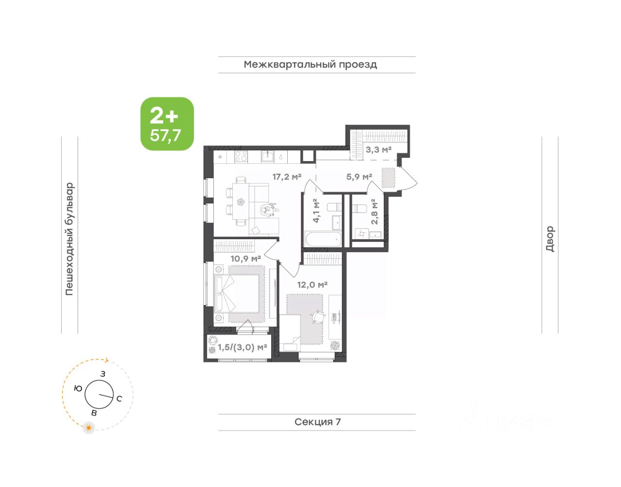 Площадь 57,7 кв.м. с двумя спальнями, двумя санузлами, кухней-гостиной и продуманным зонированием.
