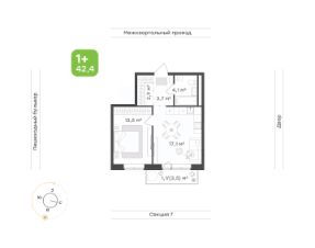 Площадь 42,4 кв.м. с совмещенной кухней-гостиной, обособленной спальней, личной гардеробной и возможностью оборудовать рабочее место.