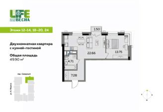 Продаётся 2-комнатная квартира с кухней-гостиной от девелопера UDS в ЖК ECO Life Весна, дом 3. Площадь — 49,9 м². Дом бизнес-класса в центре Ижевска, рядом с администрацией города.