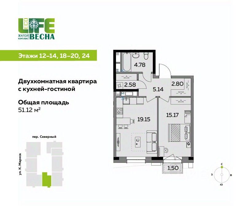 Продаётся 2-комнатная квартира с кухней-гостиной от девелопера UDS в ЖК ECO Life Весна, дом 3. Площадь — 51,12 м². Дом бизнес-класса в центре Ижевска, рядом с администрацией города.