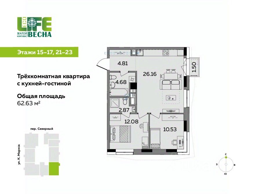 Продаётся 3-комнатная квартира с кухней-гостиной от застройщика в ЖК ECO Life Весна, дом 3. Площадь — 62,6 м². Дом бизнес-класса в центре Ижевска, рядом с администрацией города. Планировка идеально подходит для семьи: •Просторная кухня-гостиная 26,16 м² — объединяет семью и друзей за большим столом. •Уютная мастер-спальня 12 м² — личное пространство родителей. •Детская с угловым остеклением — больше света для комфортной учебы ребёнка. •Два санузла и продуманные места для хранения. • Окна на 2 стороны света — максимум света и уюта в течение дня. Двор без машин, экопарк 1 гектар Рядом есть всё для развития и экономии времени на поездки: детские сады 235, 189, 287, 241, 73, школы 5, 88, 11, 27, частные школы Sok, Nova, развивающие центры Маленький гений, Сова, Знайка, АБВГД+, Tocky Talky, Cherry-Pick, Оранжевый лев, Монтессори дворик, Слушарики Магазины, кафе и салоны красоты — в комплексе; Подземный паркинг, наземная стоянка и охрана 24/7 Сервисы отеля у вас дома. Проводите время с родными, стройте карьеру мы возьмем на себя бытовые хлопоты: от регулярной уборки до химчистки мебели. Переходите на новый уровень жизни! Четыре дома комплекса уже сданы, и в них счастливо живут семьи. Успейте приобрести квартиру мечты в последнем доме комплекса ECO Life Весна! ecolife, жк eco life весна, жк эко лайф ижевск, жк эколайф, жк эколайф весна ижевск, жк эколайф ижевск, эко лайф ижевск, эколайф, Эко лайф, Эколайф, Eco Life, EcoLife