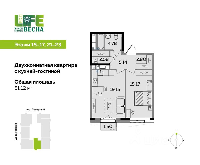 Продаётся 2-комнатная квартира с кухней-гостиной от девелопера UDS в ЖК ECO Life Весна, дом 3. Площадь — 51,12 м². Дом бизнес-класса в центре Ижевска, рядом с администрацией города. Удобная и современная планировка: • Кухня-гостиная 19,15 м² — место для встреч и отдыха. • Спальня 15,17 м² — уютная зона личного пространства. • Санузел 4,78 м², прихожая 5,14 м², гардеробная 2,80 м² и кладовая 2,58 м². • Окна квартиры выходят на улицу, открывая вид на город. Идеальный вариант для инвестиций. Отлично подойдёт как первая квартира для самостоятельной жизни. Двор без машин, экопарк 1 гектар Рядом есть всё для развития и экономии времени на поездки: детские сады 235, 189, 287, 241, 73, школы 5, 88, 11, 27, частные школы Sok, Nova, развивающие центры Маленький гений, Сова, Знайка, АБВГД+, Tocky Talky, Cherry-Pick, Оранжевый лев, Монтессори дворик, Слушарики Магазины, кафе и салоны красоты — в комплексе; Подземный паркинг, наземная стоянка и охрана 24/7 Сервисы отеля у вас дома. Проводите время с родными, стройте карьеру мы возьмем на себя бытовые хлопоты: от регулярной уборки до химчистки мебели. Переходите на новый уровень жизни! Четыре дома комплекса уже сданы, и в них счастливо живут семьи. Успейте приобрести квартиру мечты в последнем доме комплекса ECO Life Весна! ecolife, жк eco life весна, жк эко лайф ижевск, жк эколайф, жк эколайф весна ижевск, жк эколайф ижевск, эко лайф ижевск, эколайф, Эко лайф, Эколайф, Eco Life, EcoLife