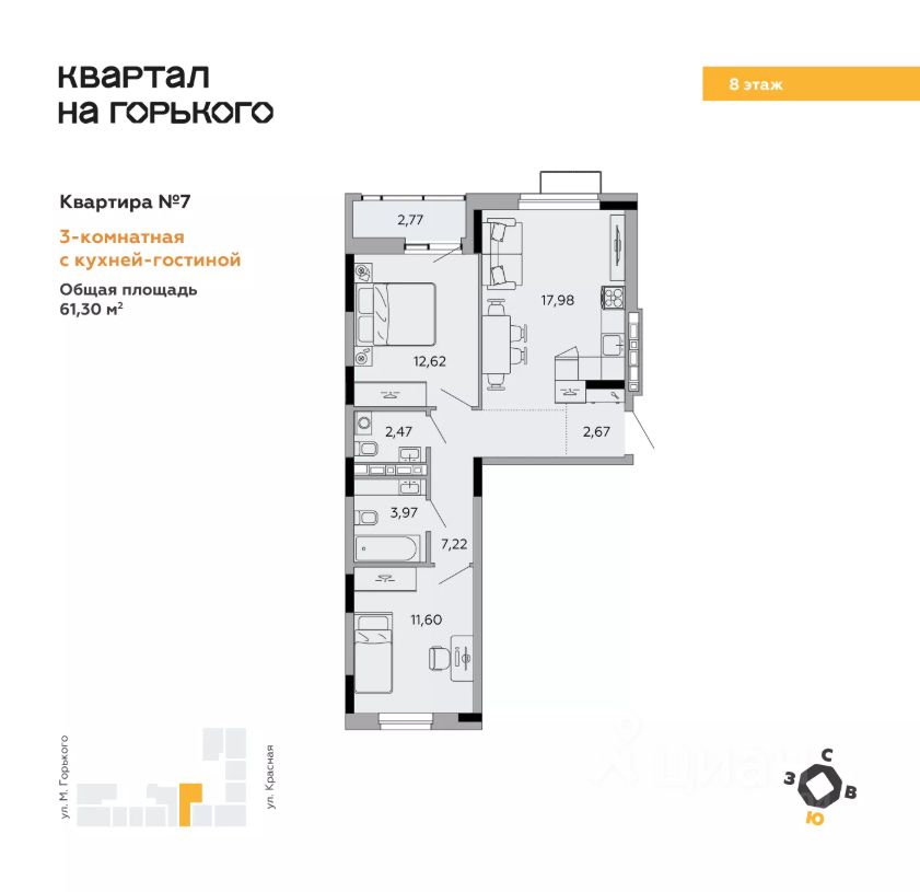 Квартира 2+ площадью 61,30 кв.м. с кухней-гостиной.