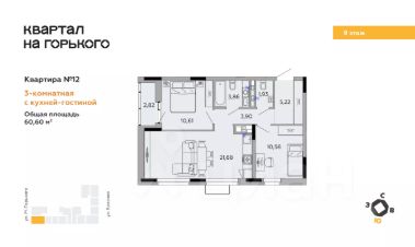 Квартира 2+ площадью 60,60 кв.м. с кухней-гостиной.