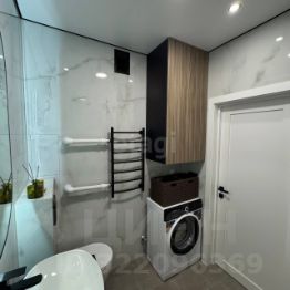 В санузле уложен крупноформатный керамогранит, установлена подвесная инсталляция Iddis, система "теплый пол", водонагреватель и стиральная машина Hotpoint.