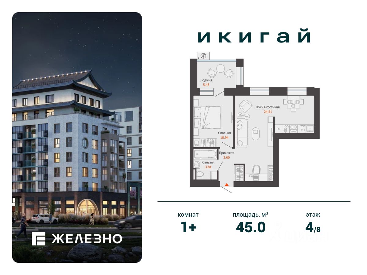 Продается 1-комнатная квартира площадью 45.00 кв. м с предчистовой отделкой. Квартира находится в жилом комплексе комфорт+ "Икигай" от федерального девелопера "Железно".