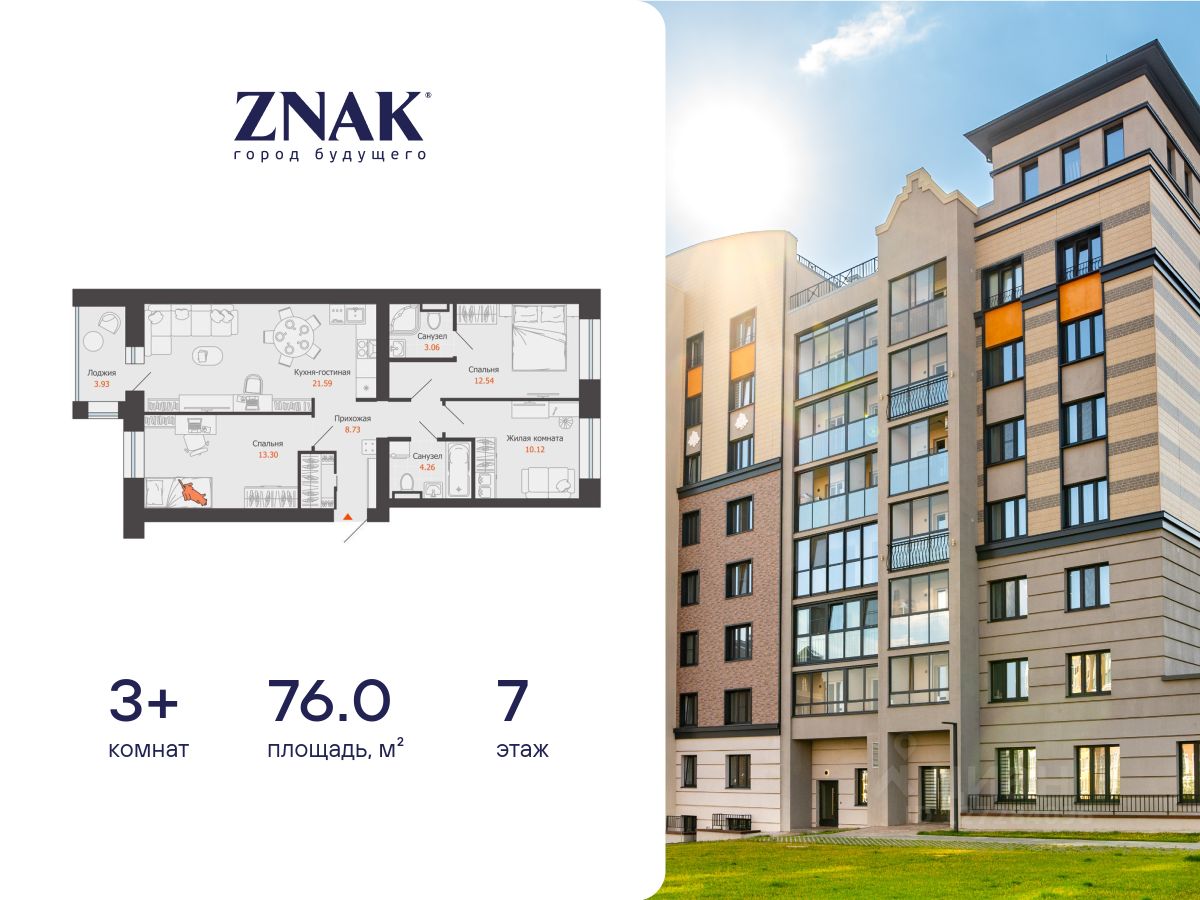 Продается 3-комнатная квартира площадью 76.00 кв. м. с предчистовой отделкой. Квартира находится в жилом комплексе комфорт-класса ZNAK, расположенном в районе ул. Берша.
