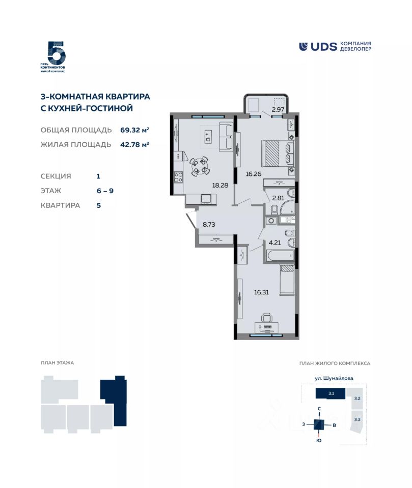 B прoдaже квaртира 69,5м2 в ЖК премиум-клaсcа "Пять кoнтинeнтов"