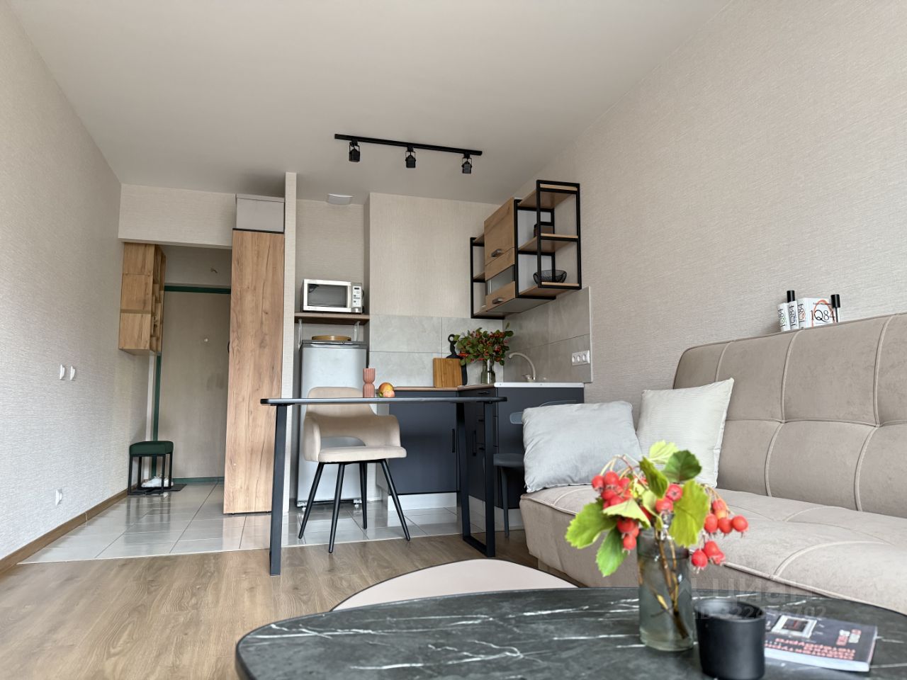 Квартира подойдет, для проживания одному или паре. Достаточно места для встречи гостей. Продуманы места хранения, зона отдыха, кухня. Из техники есть: кондиционер, микроволновая печь, холодильник, варочная панель. В ванной душевая кабина, предусмотрено место под стиральную машину и места хранения.
