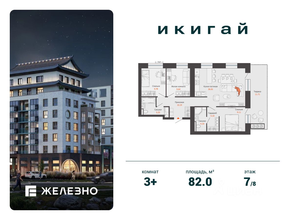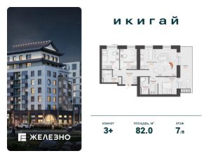 Продается 3-комнатная квартира площадью 82.00 кв. м с предчистовой отделкой. Квартира находится в жилом комплексе комфорт+ "Икигай" от федерального девелопера "Железно".