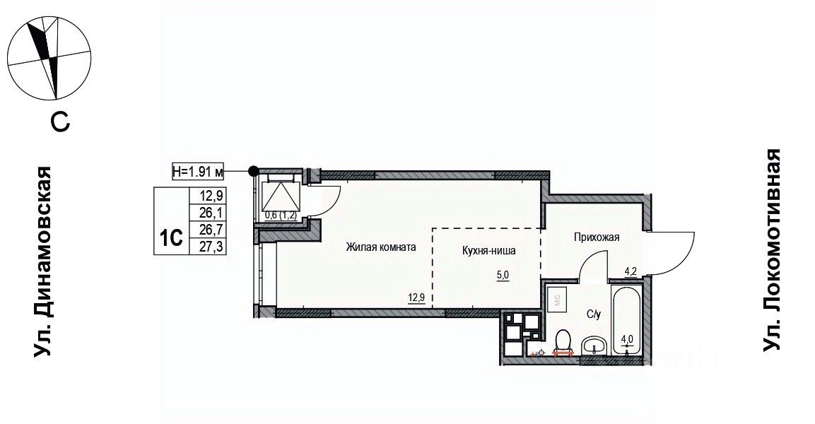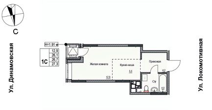 Продаётся 1-комнатная квартира в строящемся доме (Дом 1), срок сдачи: II-кв. 2027, общей площадью 26.7 кв.м., на 5 этаже. ЖК "Локомотив" - это жилой комплекс, состоящий из трех домов, объединенных стилобатом. Удобное расположение, 15 минут до центра.