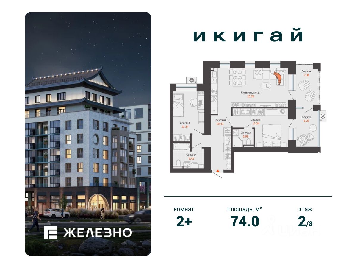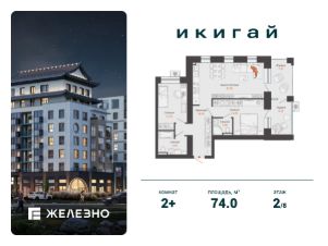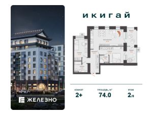 Продается 2-комнатная квартира площадью 74.00 кв. м с предчистовой отделкой. Квартира находится в жилом комплексе комфорт+ "Икигай" от федерального девелопера "Железно".