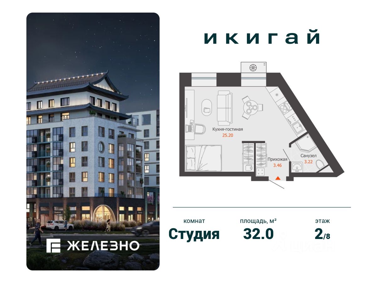 Продается студия площадью 32.00 кв. м с чистовой отделкой. Квартира находится в жилом комплексе комфорт+ "Икигай" от федерального девелопера "Железно".