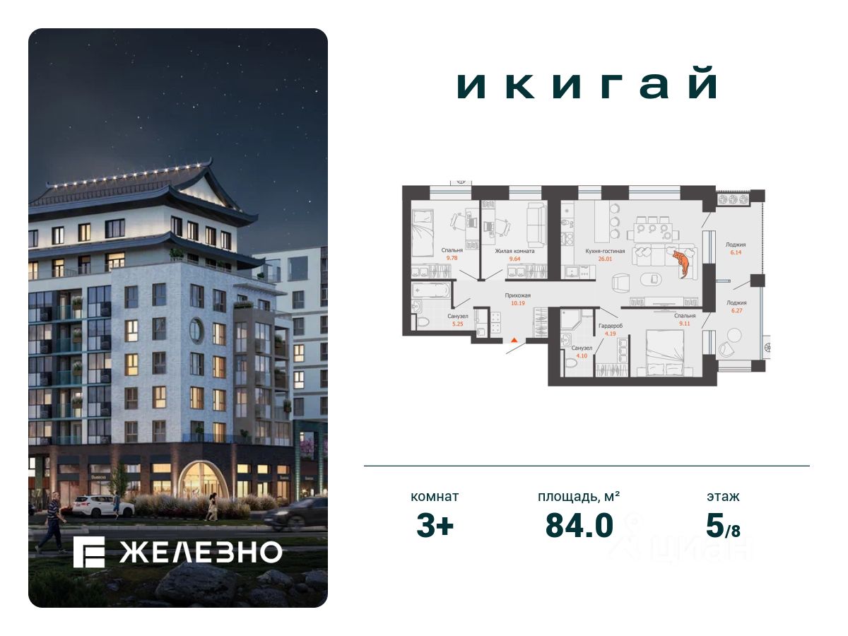 Продается 3-комнатная квартира площадью 84.00 кв. м с предчистовой отделкой. Квартира находится в жилом комплексе комфорт+ "Икигай" от федерального девелопера "Железно".