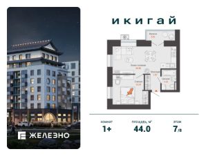 Продается 1-комнатная квартира площадью 44.00 кв. м с предчистовой отделкой. Квартира находится в жилом комплексе комфорт+ "Икигай" от федерального девелопера "Железно".