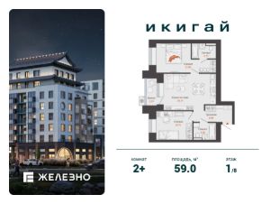 Продается 2-комнатная квартира площадью 59.00 кв. м с предчистовой отделкой. Квартира находится в жилом комплексе комфорт+ "Икигай" от федерального девелопера "Железно".