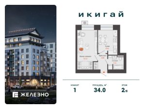 Продается 1-комнатная квартира площадью 34.00 кв. м с предчистовой отделкой. Квартира находится в жилом комплексе комфорт+ "Икигай" от федерального девелопера "Железно".