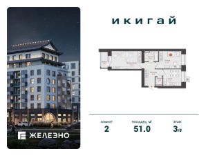 Продается 2-комнатная квартира площадью 51.00 кв. м с предчистовой отделкой. Квартира находится в жилом комплексе комфорт+ "Икигай" от федерального девелопера "Железно".