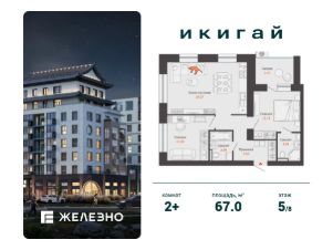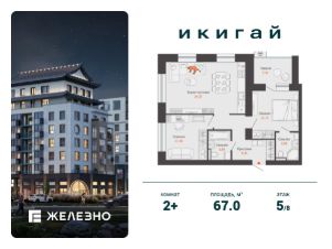 Продается 2-комнатная квартира площадью 67.00 кв. м с предчистовой отделкой. Квартира находится в жилом комплексе комфорт+ "Икигай" от федерального девелопера "Железно".