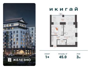 Продается 1-комнатная квартира площадью 45.00 кв. м с предчистовой отделкой. Квартира находится в жилом комплексе комфорт+ "Икигай" от федерального девелопера "Железно".