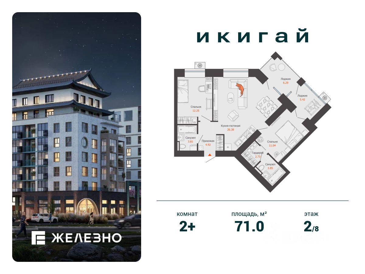 Продается 2-комнатная квартира площадью 71.00 кв. м с предчистовой отделкой. Квартира находится в жилом комплексе комфорт+ "Икигай" от федерального девелопера "Железно".