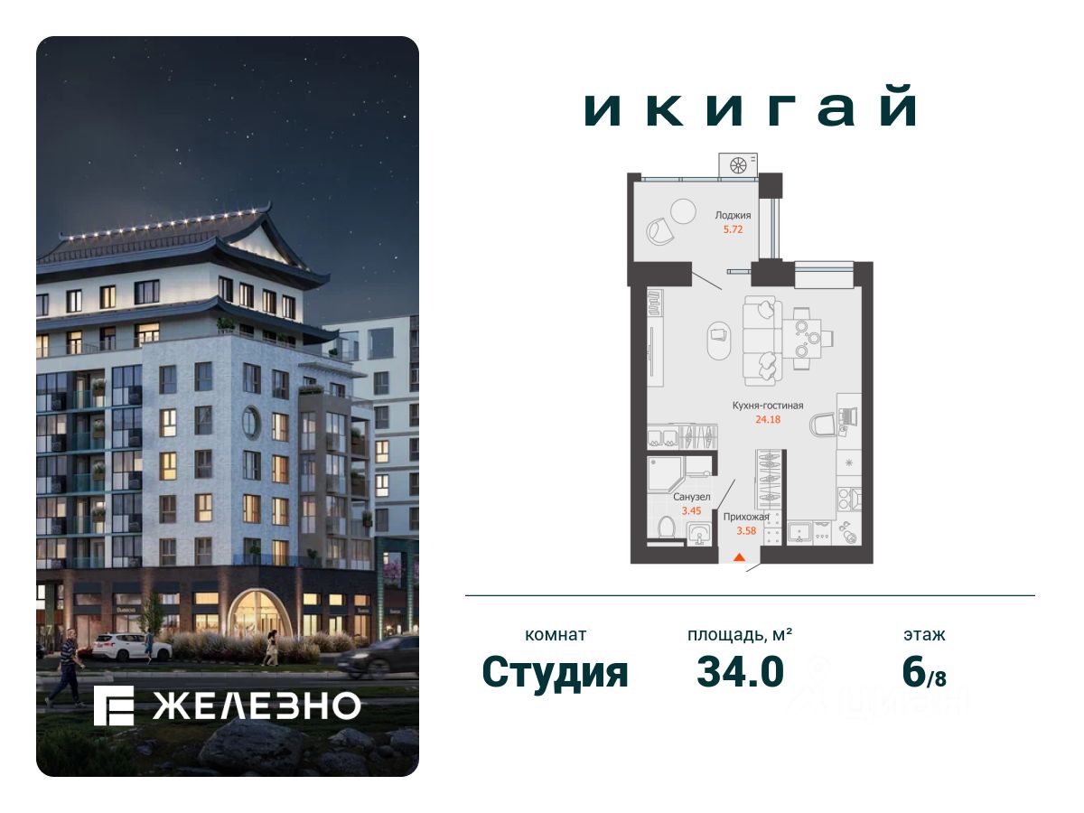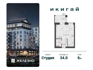Продается студия площадью 34.00 кв. м с предчистовой отделкой. Квартира находится в жилом комплексе комфорт+ "Икигай" от федерального девелопера "Железно".
