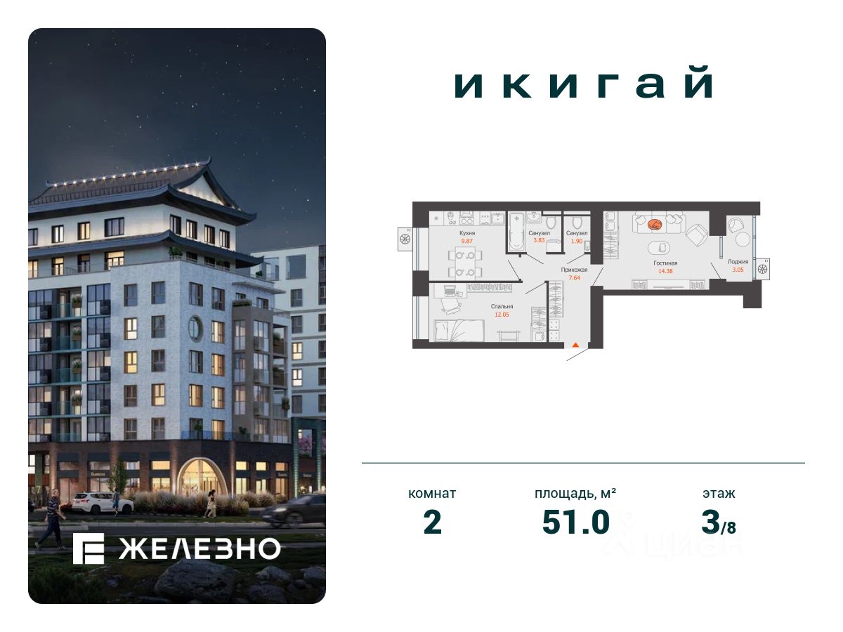 Продается 2-комнатная квартира площадью 51.00 кв. м с предчистовой отделкой. Квартира находится в жилом комплексе комфорт+ "Икигай" от федерального девелопера "Железно".