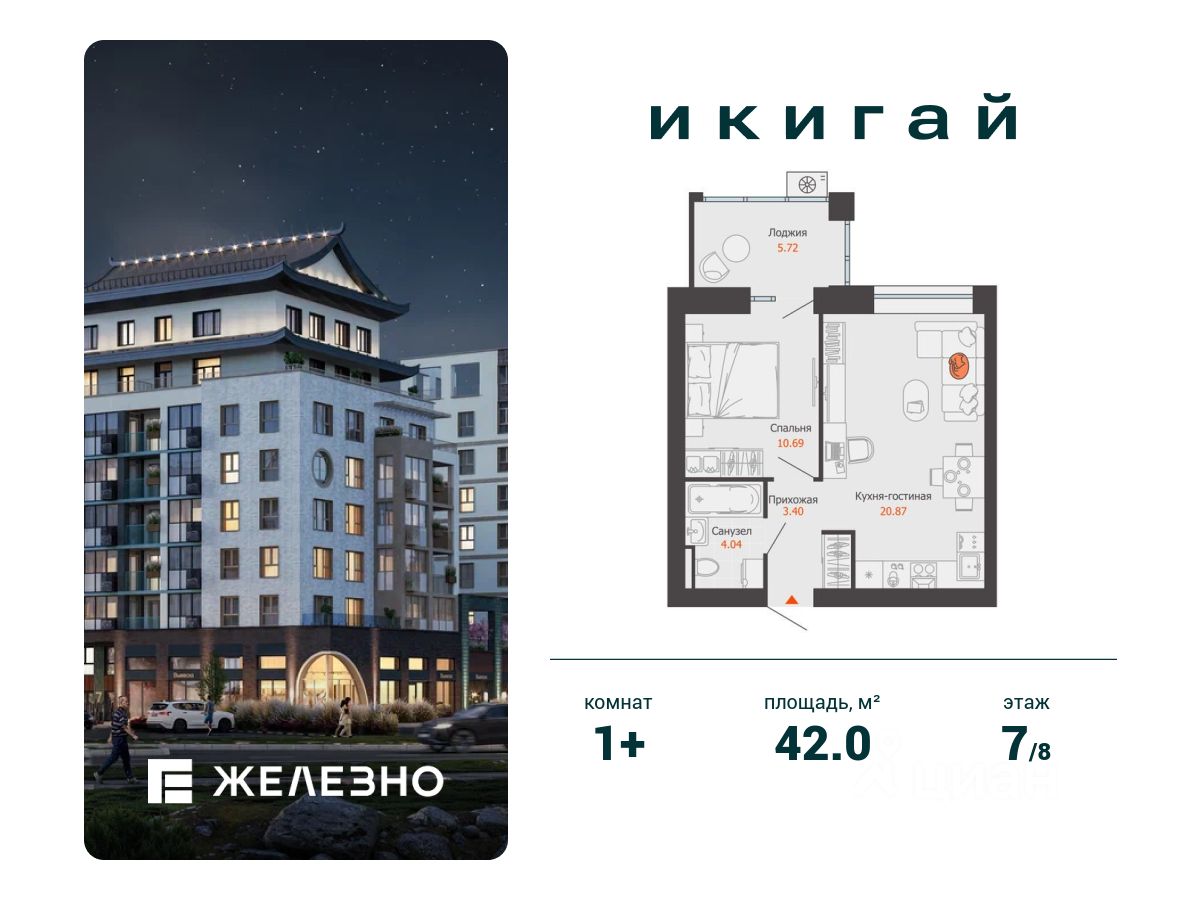 Продается 1-комнатная квартира площадью 42.00 кв. м с предчистовой отделкой. Квартира находится в жилом комплексе комфорт+ "Икигай" от федерального девелопера "Железно".