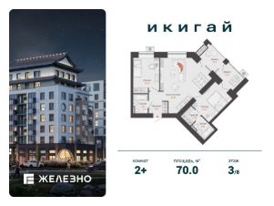 Продается 2-комнатная квартира площадью 70.00 кв. м с предчистовой отделкой. Квартира находится в жилом комплексе комфорт+ "Икигай" от федерального девелопера "Железно".