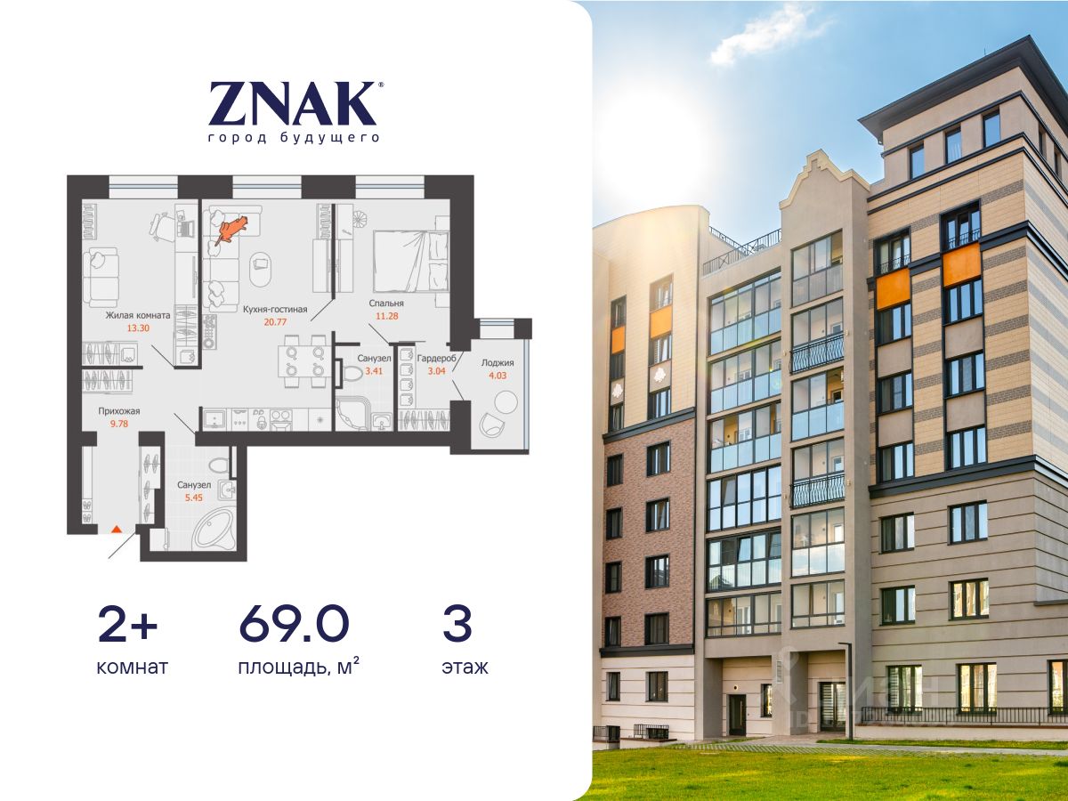 Продается 2-комнатная квартира площадью 69.00 кв. м. с предчистовой отделкой. Квартира находится в жилом комплексе комфорт-класса ZNAK, расположенном в районе ул. Берша.