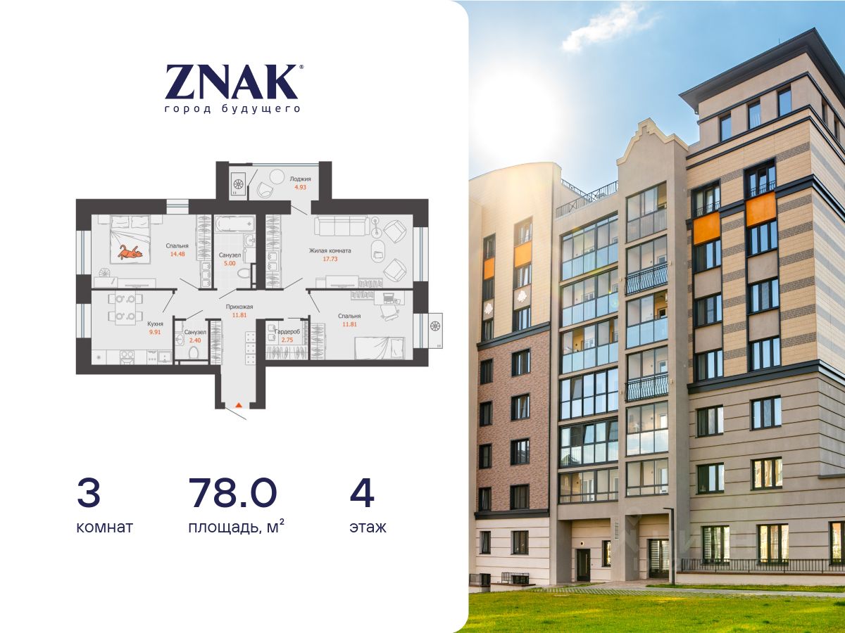 Продается 3-комнатная квартира площадью 78.00 кв. м. с предчистовой отделкой. Квартира находится в жилом комплексе комфорт-класса ZNAK, расположенном в районе ул. Берша.
