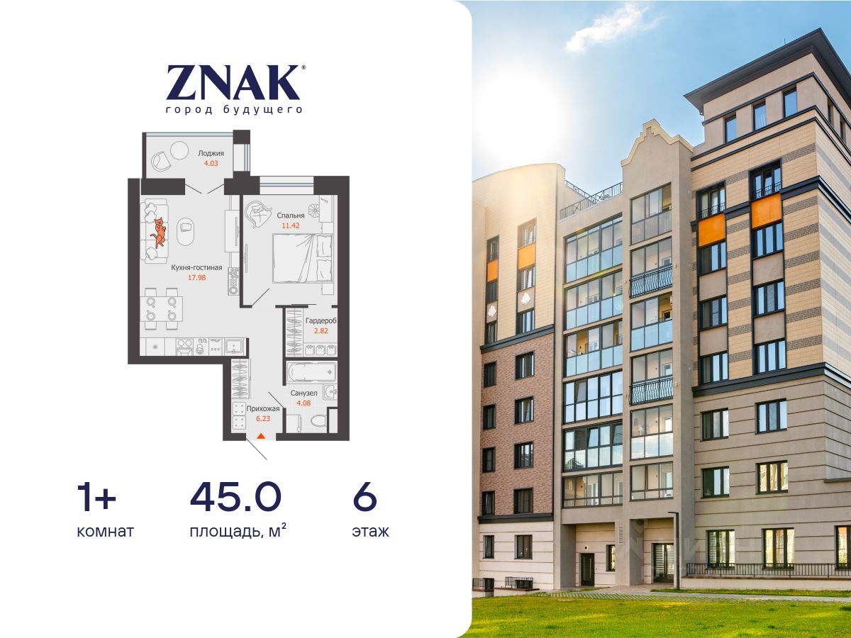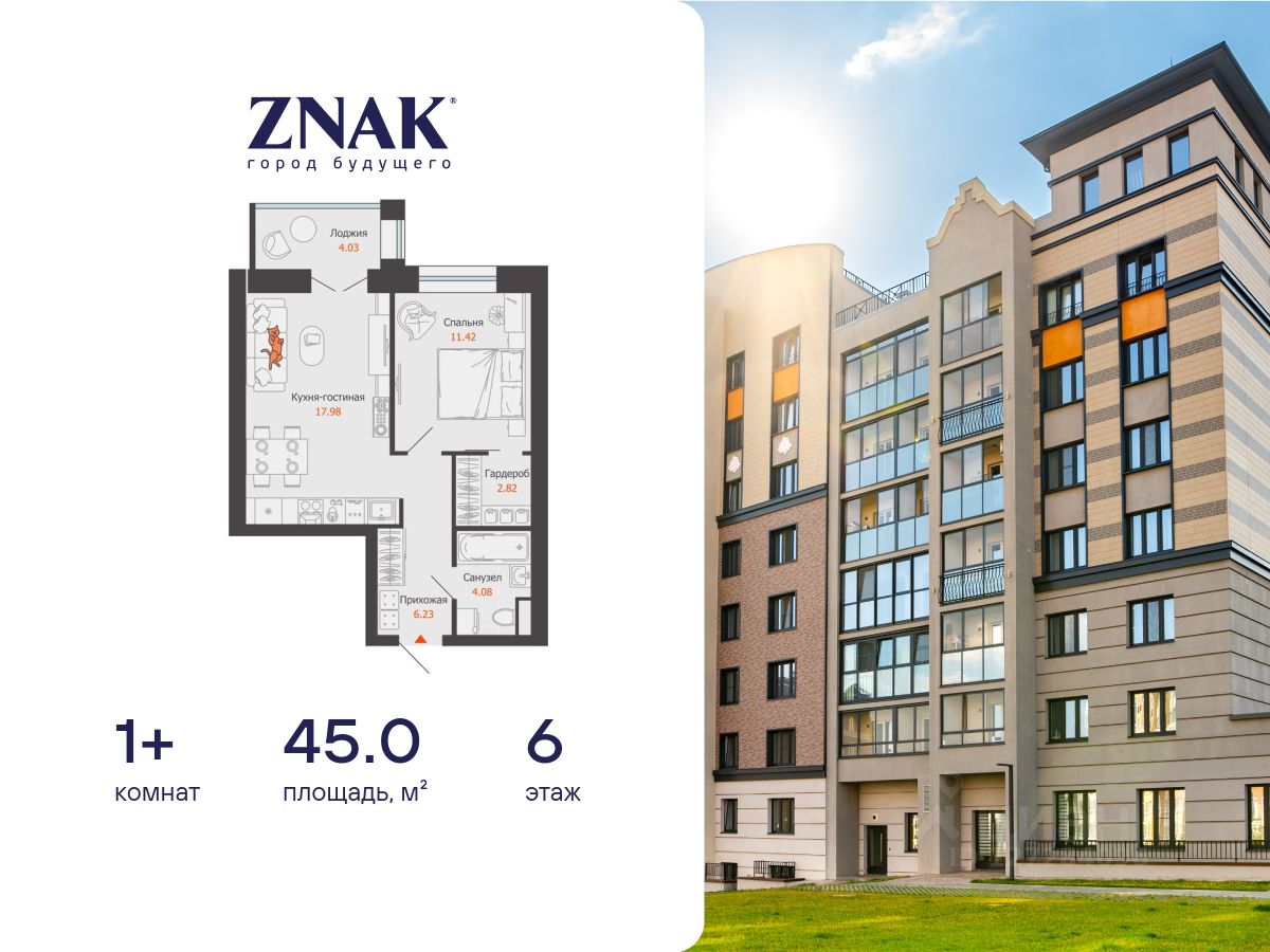 Продается 1-комнатная квартира площадью 45.00 кв. м. Квартира находится в жилом комплексе комфорт-класса ZNAK, расположенном в районе ул. Берша.