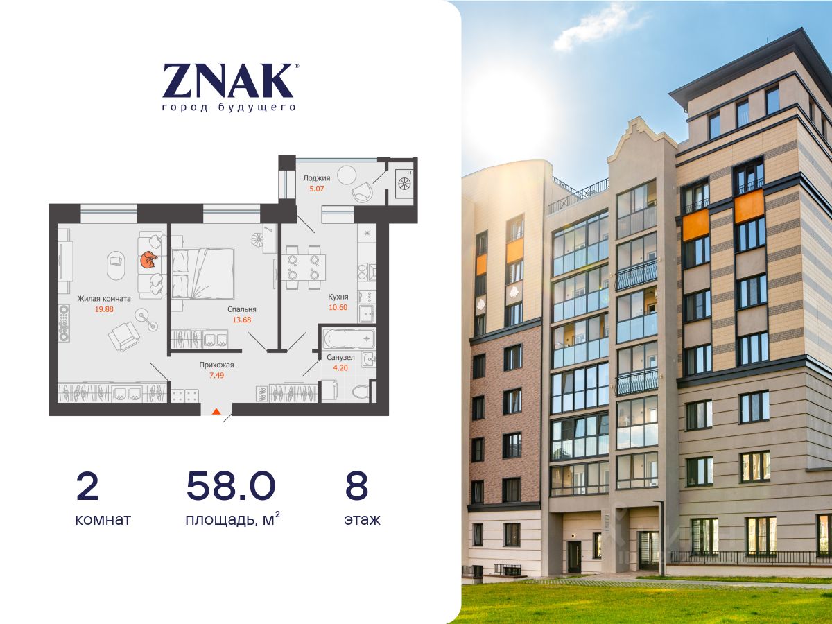 Продается 2-комнатная квартира площадью 58.00 кв. м. с предчистовой отделкой. Квартира находится в жилом комплексе комфорт-класса ZNAK, расположенном в районе ул. Берша.