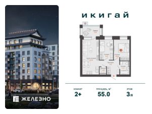 Продается 2-комнатная квартира площадью 55.00 кв. м с чистовой отделкой. Квартира находится в жилом комплексе комфорт+ "Икигай" от федерального девелопера "Железно".