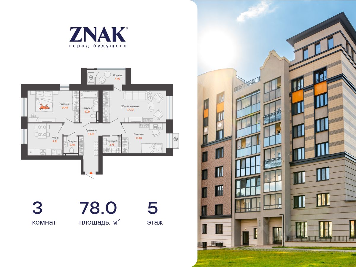 Продается 3-комнатная квартира площадью 78.00 кв. м. с предчистовой отделкой. Квартира находится в жилом комплексе комфорт-класса ZNAK, расположенном в районе ул. Берша.