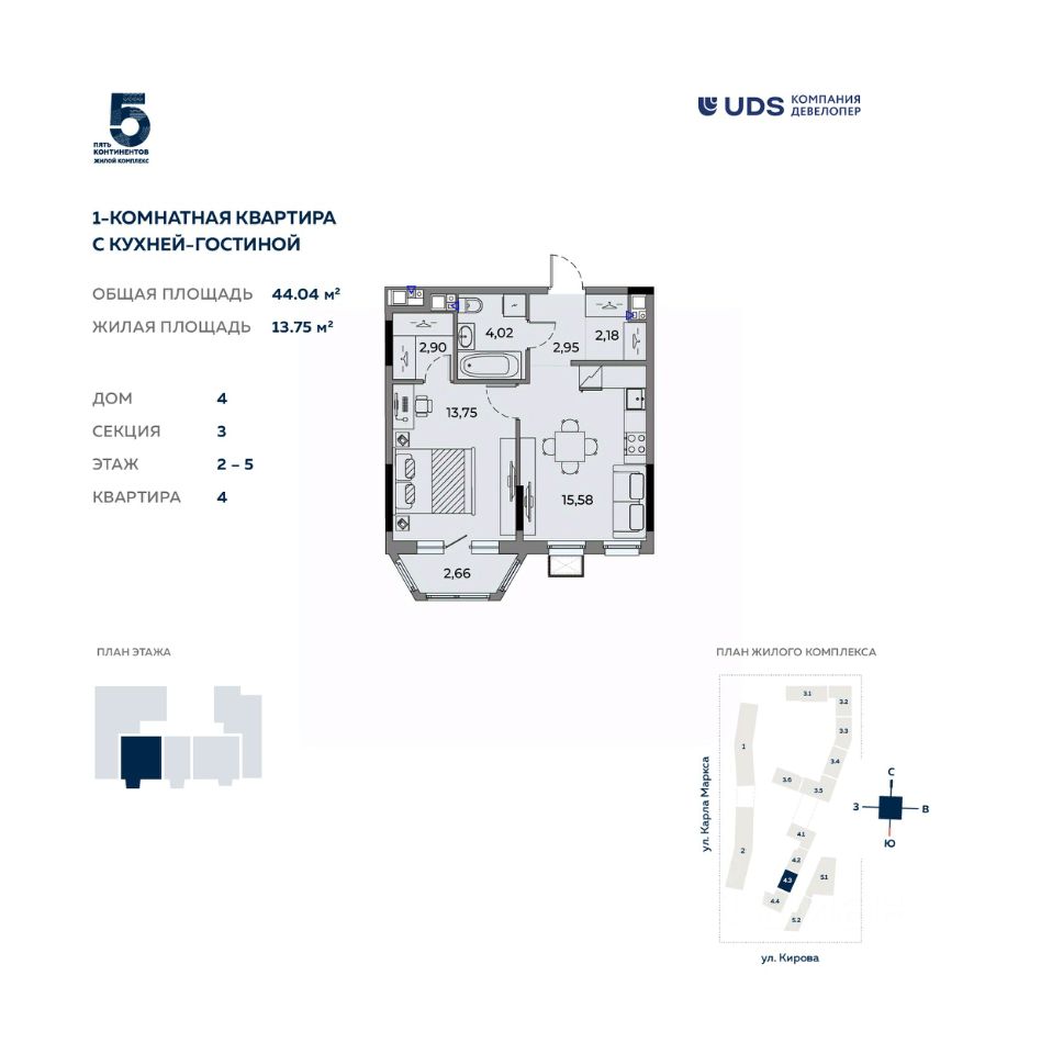 Бизнес-класс на ул. Кирова. Воплощайте мечты о доме в бульварном квартале "Пять континентов". Здесь вы сможете жить в центре Ижевска в эстетичном современном пространстве. Дома комплекса спроектированы по европейским тенденциям международным архитектурным бюро MLA+. Здесь общественные городские и частные зоны разделены не привычными заборами, а гармонично соседствуют друг с другом. Вдоль домов "Пяти континентов" пройдет городской пешеходный бульвар и станет новым маршрутом прогулок и отдыха. Бульвар начнется со сквера на пересечении улиц Кирова и Карла Маркса. И уже сейчас часть сквера построена, приходите и оцените вживую. Если вы хотите жить в невысотном доме в спокойной обстановке, то в "Пяти континентах" вам подойдут уютные дома с эркерами и лоджиями высотой всего 6, 7 и 9 этажей. А если нравятся высотные дома, то в "Пяти континентах" вы увидите и высотные секции внутри квартала высотой 12 и 17 этажей. Ездить на автомобиле ежедневно или добираться пешком жителям "Пяти континентах" удобно одинаково. В комплексе есть подземный паркинг, и, в целом, он выгодно расположен на пересечении улиц Кирова и Карла Маркса, рядом с остановкой "Магазин "Океан". В 15 минутах хотьбы - Центральная площадь и набережная. Здания комплекса примыкают друг другу торцами и создают единую архитектурную форму. Дома по обе стороны бульвара задают направление для прогулок, а волнообразный рисунок брусчатки и плавные изгибы делают бульвар похожим на русло реки. Каждый дом комплекса отличается от другого этажностью, формой, цветом, геометрией фасада. • 6-17 этажей высота домов, • Всего 5 квартир на этаже, • На -1 этаже подземный паркинг, • Высота потолка 2,7 м, • Сквозной вход в дом с улицы и со двора, • Огороженный двор без машин. Передача ключей 1 квартал 2028 года.