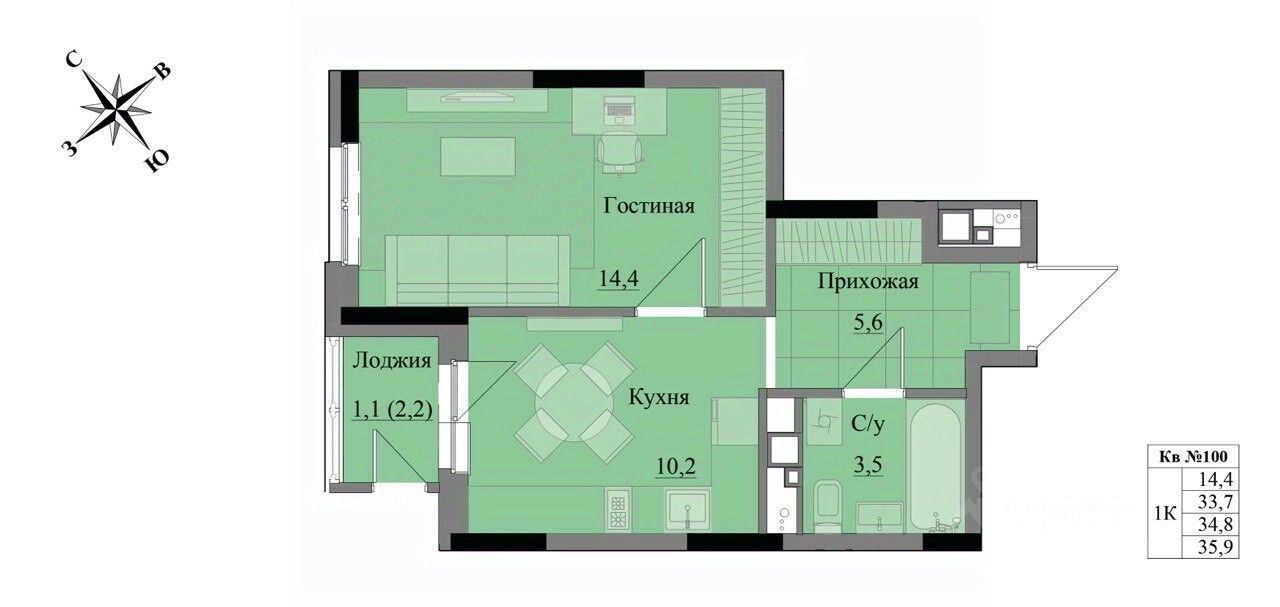 Общая площадь34,8 м²