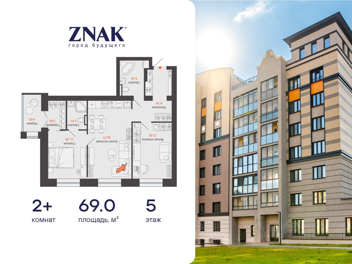 Продается 2-комнатная квартира площадью 69.00 кв. м. с предчистовой отделкой. Квартира находится в жилом комплексе комфорт-класса ZNAK, расположенном в районе ул. Берша.