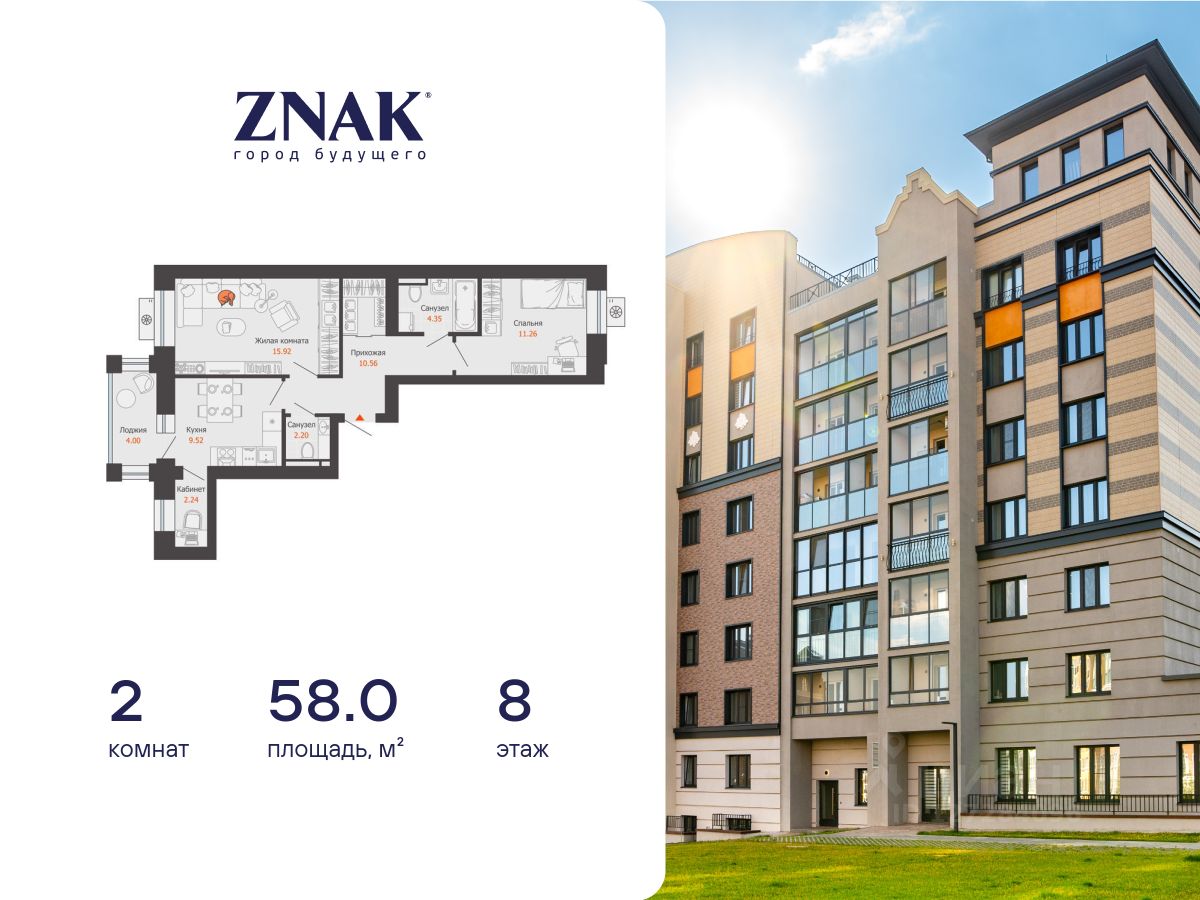 Продается 2-комнатная квартира площадью 58.00 кв. м. с предчистовой отделкой. Квартира находится в жилом комплексе комфорт-класса ZNAK, расположенном в районе ул. Берша.