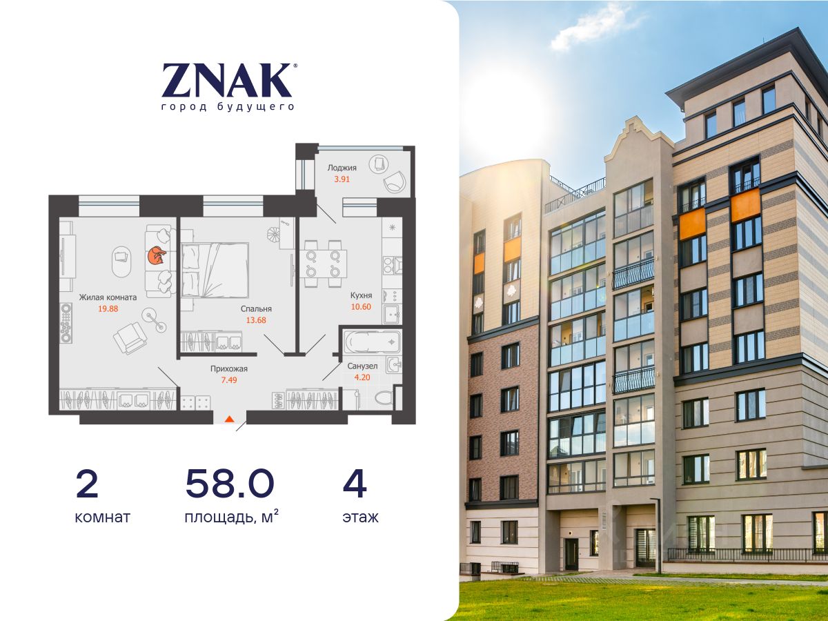 Продается 2-комнатная квартира площадью 58.00 кв. м. с предчистовой отделкой. Квартира находится в жилом комплексе комфорт-класса ZNAK, расположенном в районе ул. Берша.