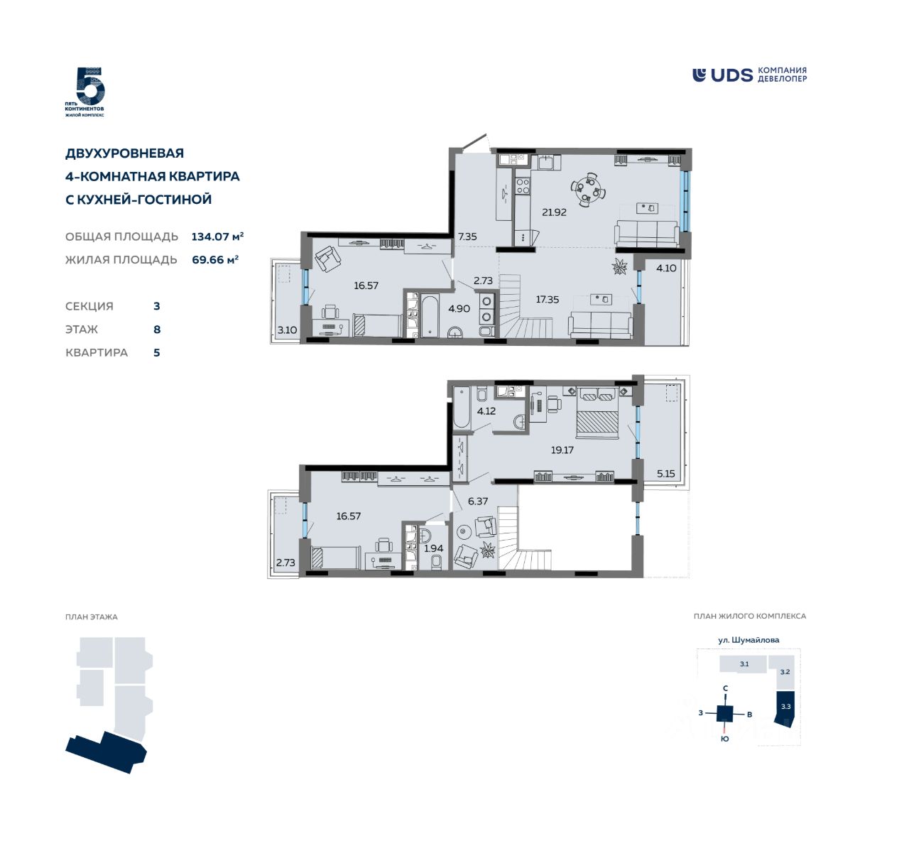 Если вы хотите жить в невысотном доме в спокойной обстановке, то в "Пяти континентах" вам подойдут уютные дома с эркерами и лоджиями высотой всего 6, 7 и 9 этажей. А если нравятся высотные дома, то в "Пяти континентах" вы увидите и высотные секции внутри квартала высотой 12 и 17 этажей.