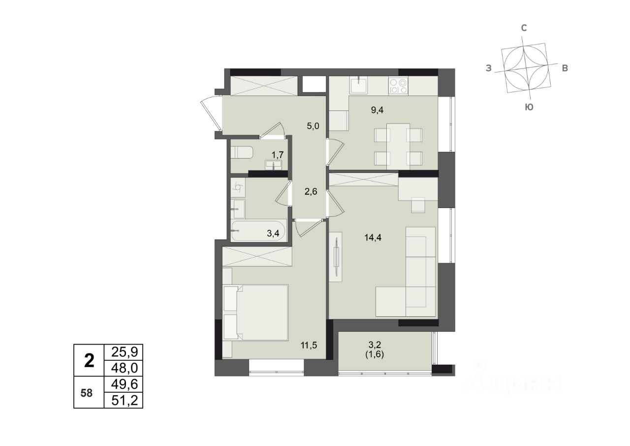 Общая площадь49,6 м²