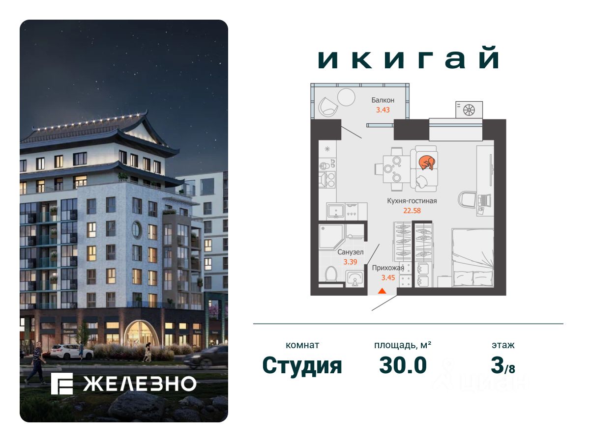 Продается студия площадью 30.00 кв. м с предчистовой отделкой. Квартира находится в жилом комплексе комфорт+ "Икигай" от федерального девелопера "Железно".