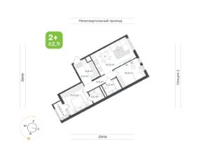 Площадь 62,9 кв.м. с двумя спальнями, двумя санузлами, кухней-гостиной и продуманным зонированием.