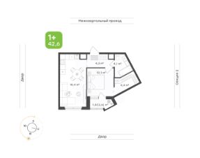 Площадь 42,6 кв.м. с совмещенной кухней-гостиной, обособленной спальней, личной гардеробной и возможностью оборудовать рабочее место.