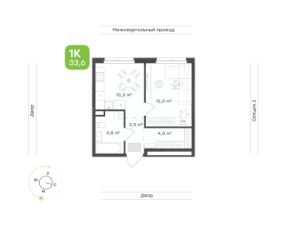Площадь 33,6 кв.м. с удобной планировкой: отдельная спальня, кухня и дополнительное место для хранения.