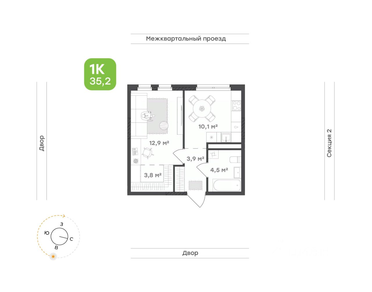 Площадь 35,2 кв.м. с классической планировкой: изолированная спальня и кухня.