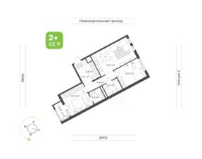 Площадь 62,9 кв.м. с двумя спальнями, двумя санузлами, кухней-гостиной и продуманным зонированием.